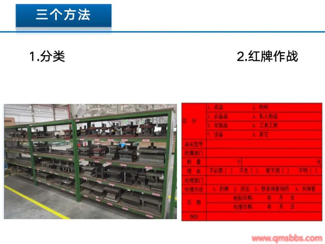 “红牌作战”:对你工作区域内的所有物品(工具、物料、文件、个人物品等)进行检查,给那些不需要用不上多余的物品贴上“红牌”(或用其他醒目方式标记)。