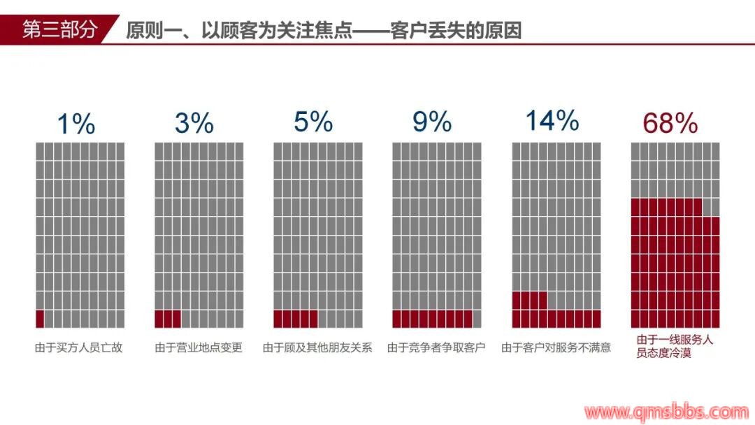 组织依存于顾客,这话听着虚,实际最实在。客户丢单的原因统计过没?68%是因为服务态度,9%是产品问题,16%是价格。这个数据猛吧?产品质量只占9%,服务占了68%!