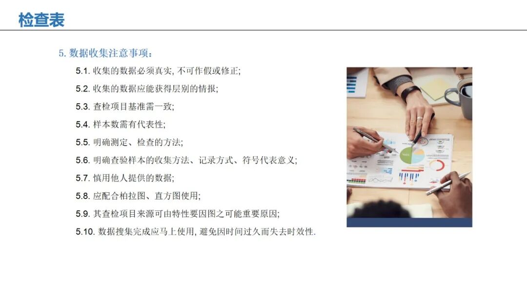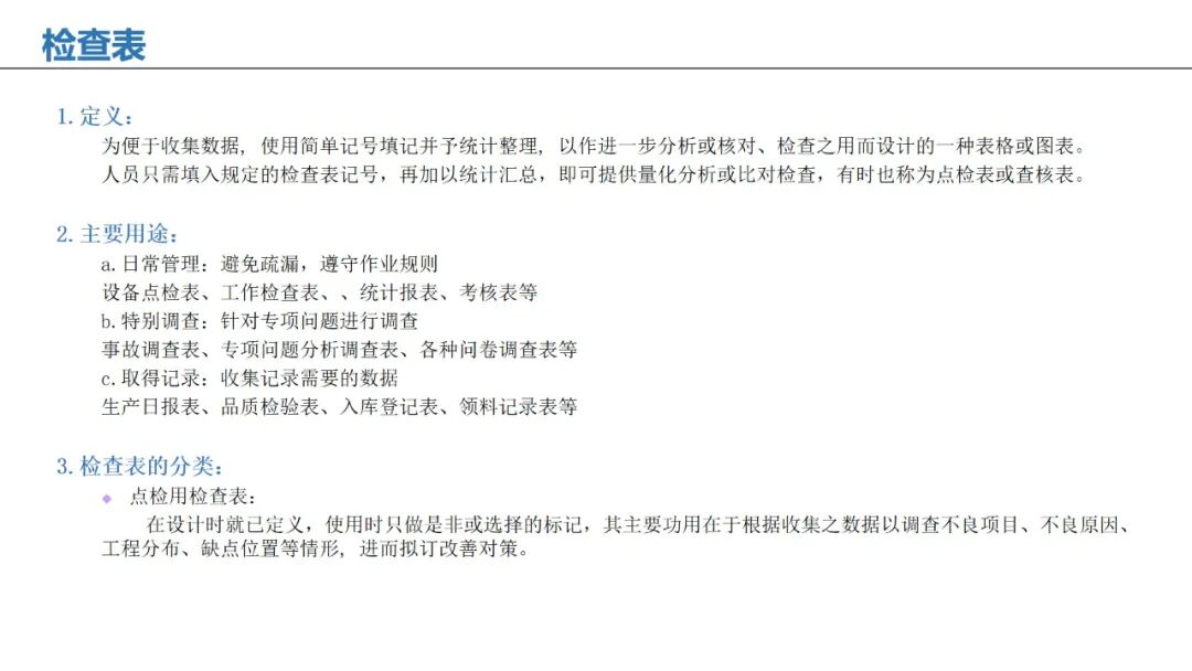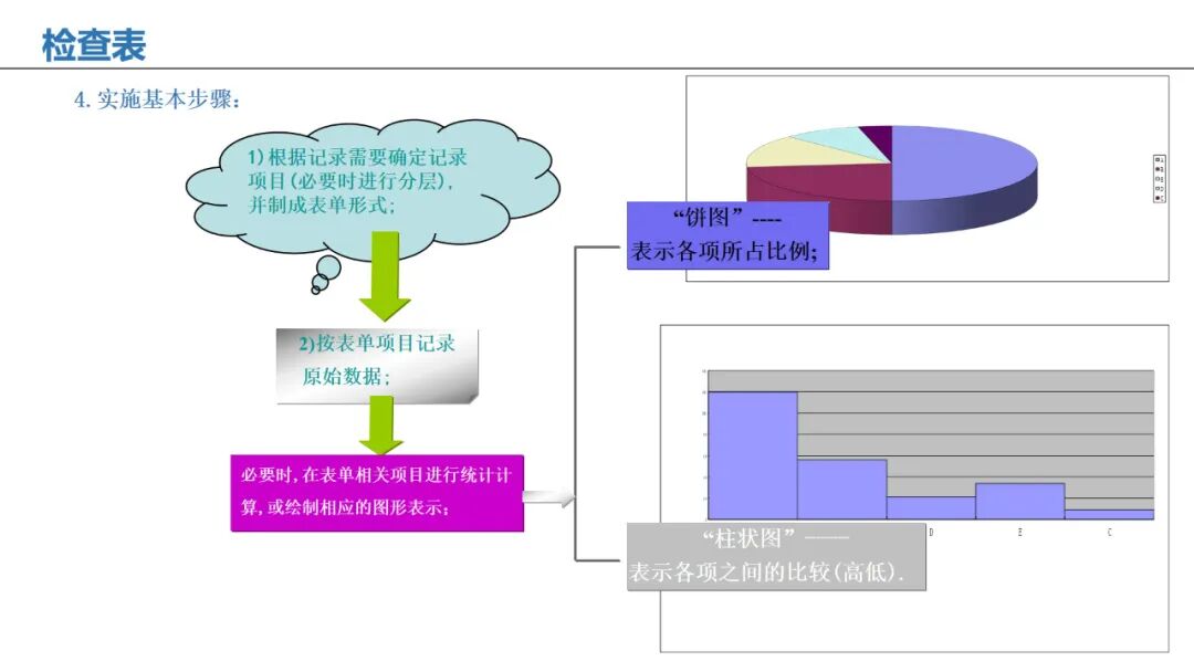 应用:系统化收集数据,记录问题频率、位置或类型,便于快速统计分析。