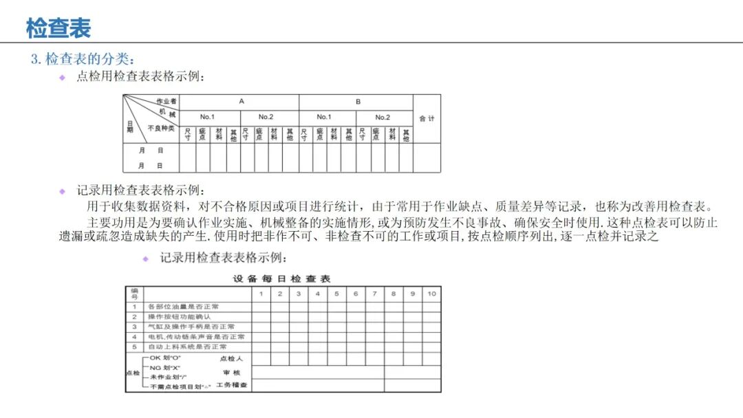 示例:生产缺陷记录表、设备点检表。