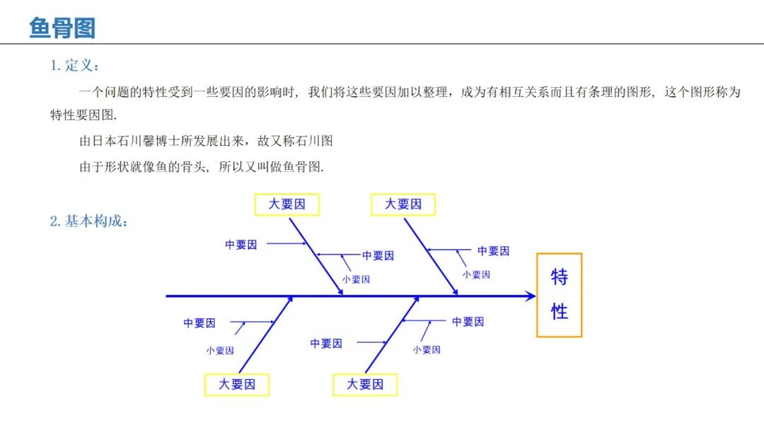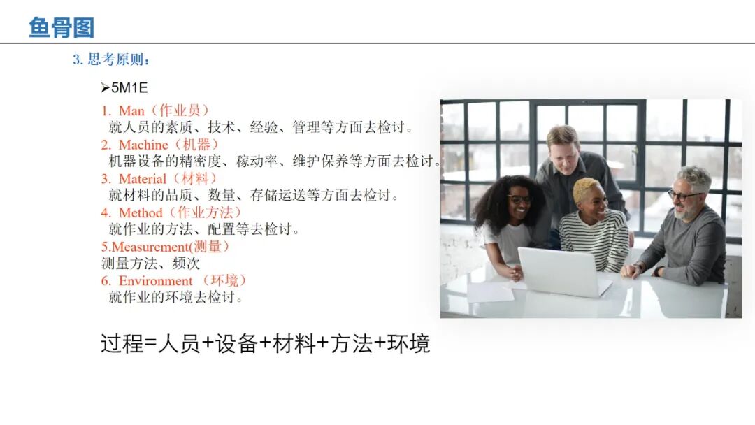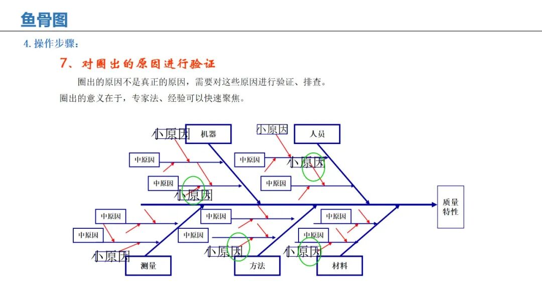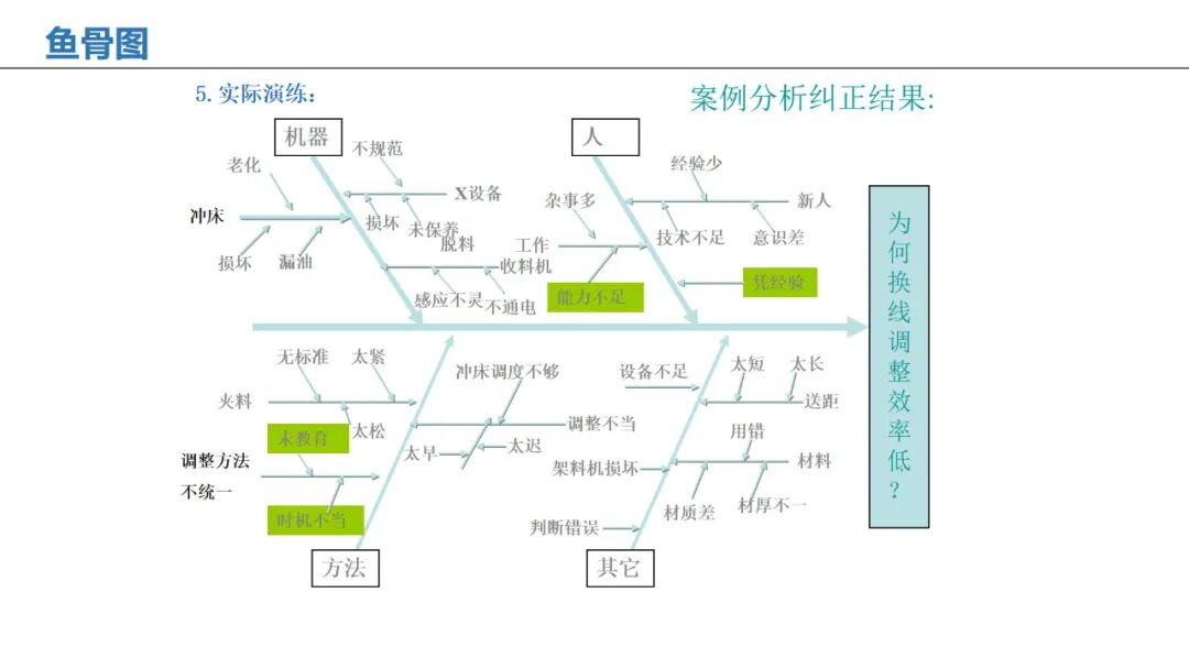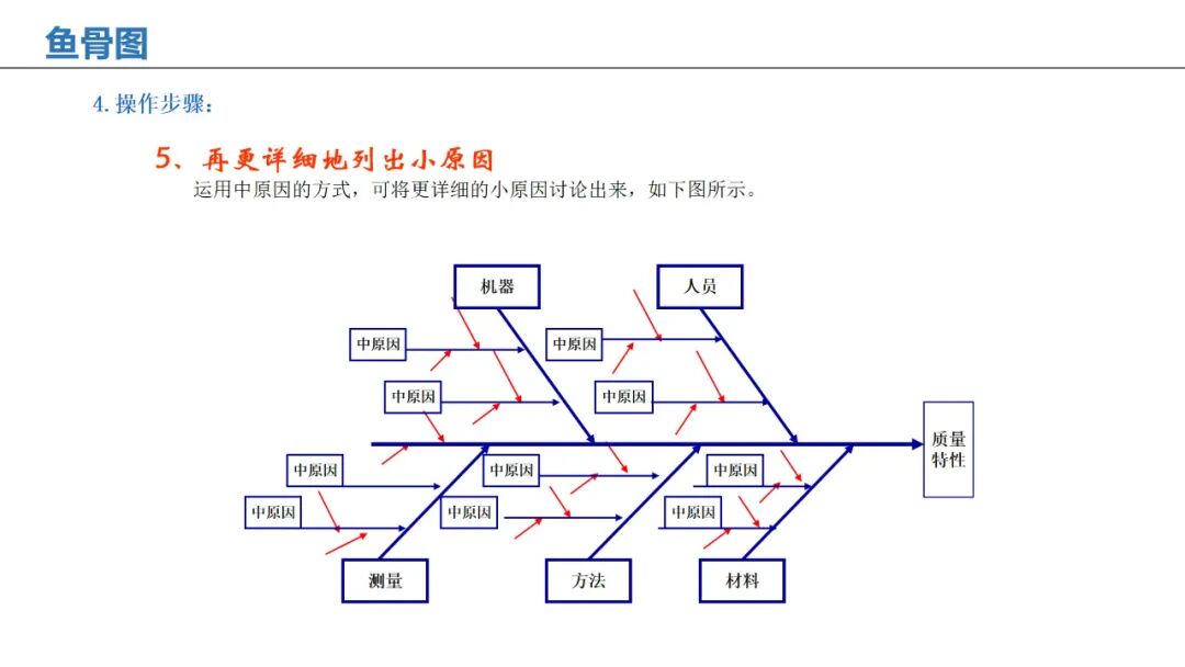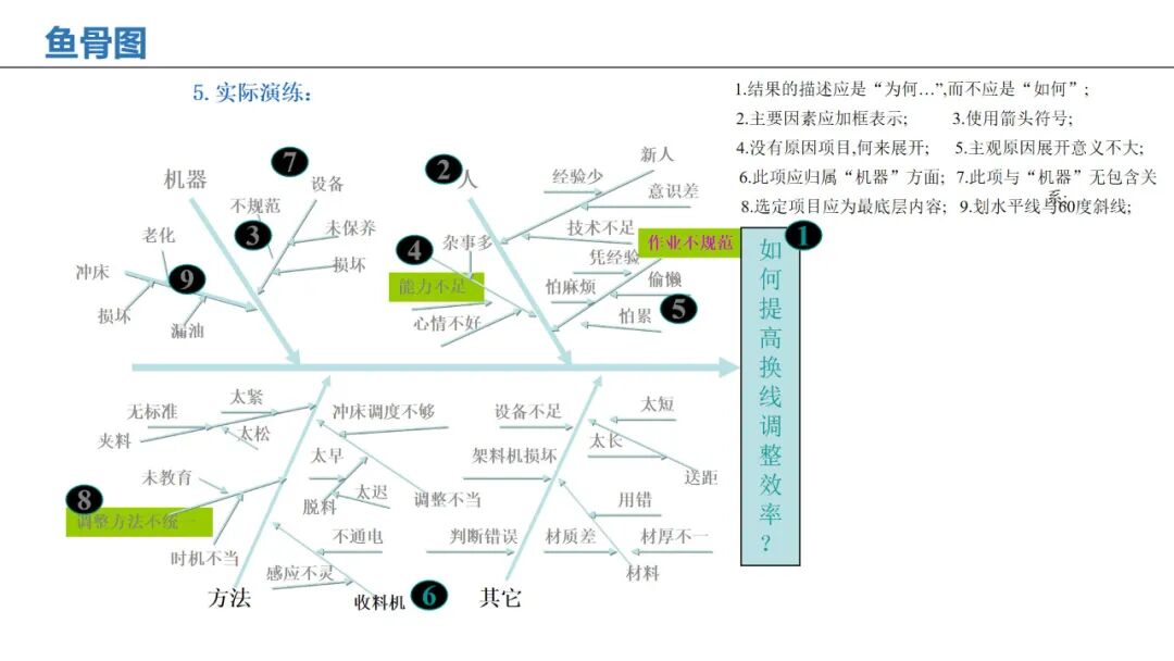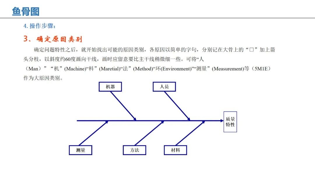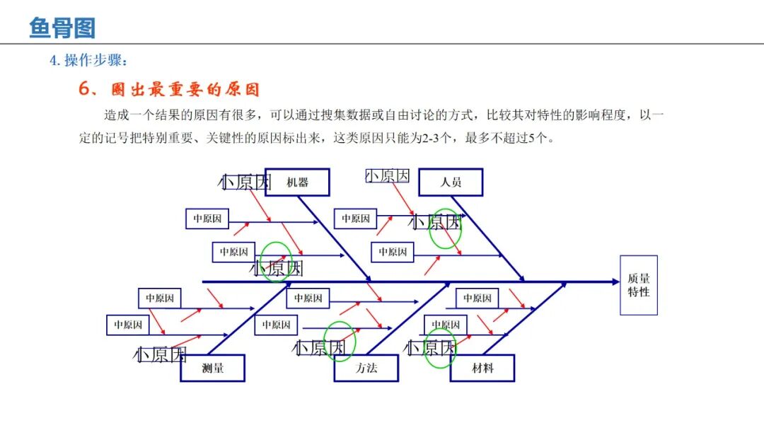 应用:通过人、机、料、法、环、测等维度,系统性分析问题根本原因。