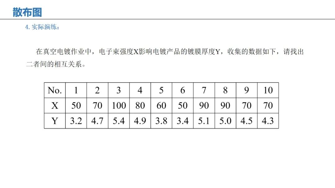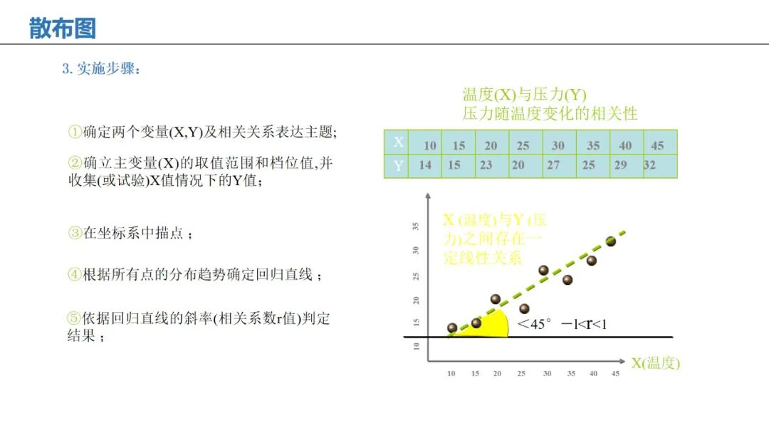 应用:分析两个变量之间的相关性(如温度与成品率)。