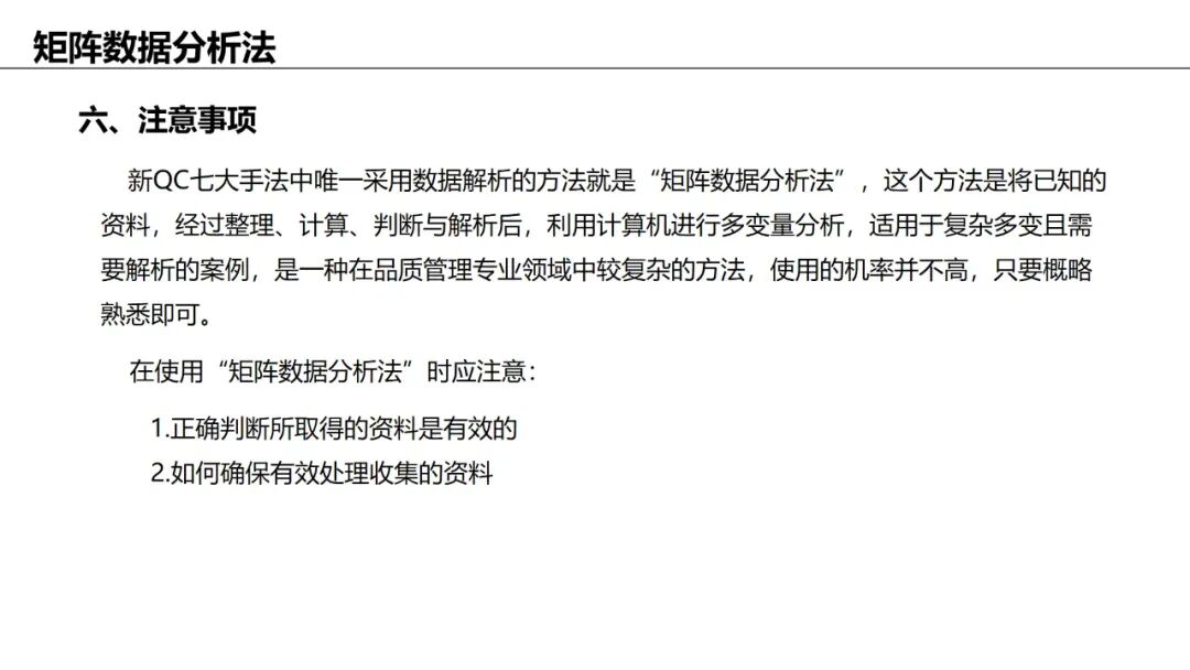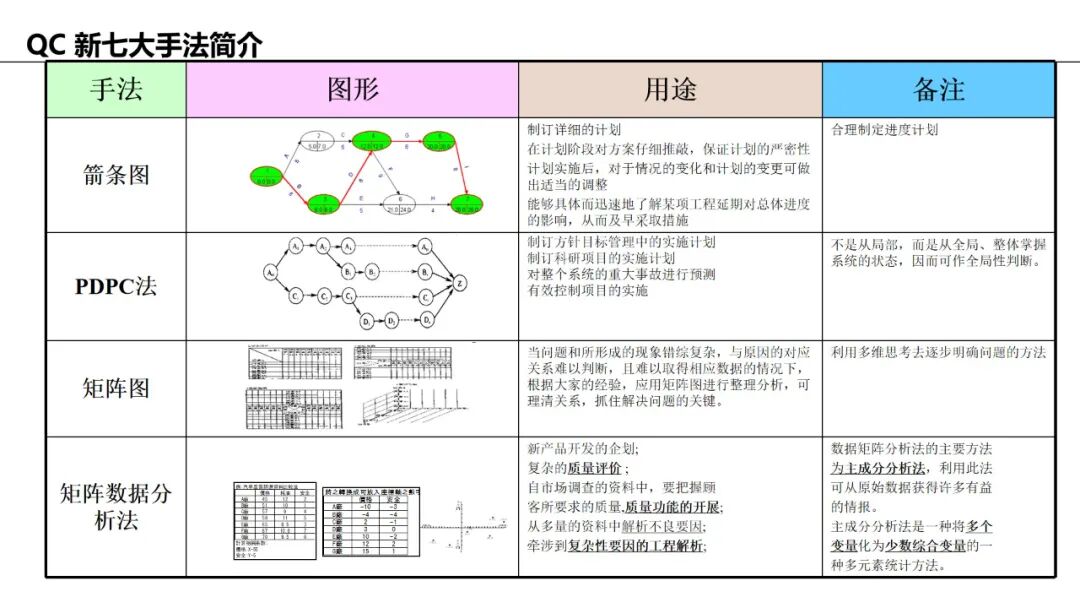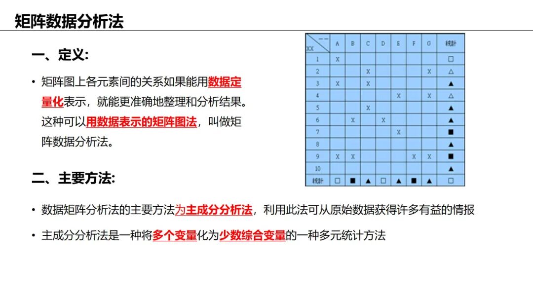 应用:对矩阵图中的数据进行定量分析(多变量分析),如主成分分析。