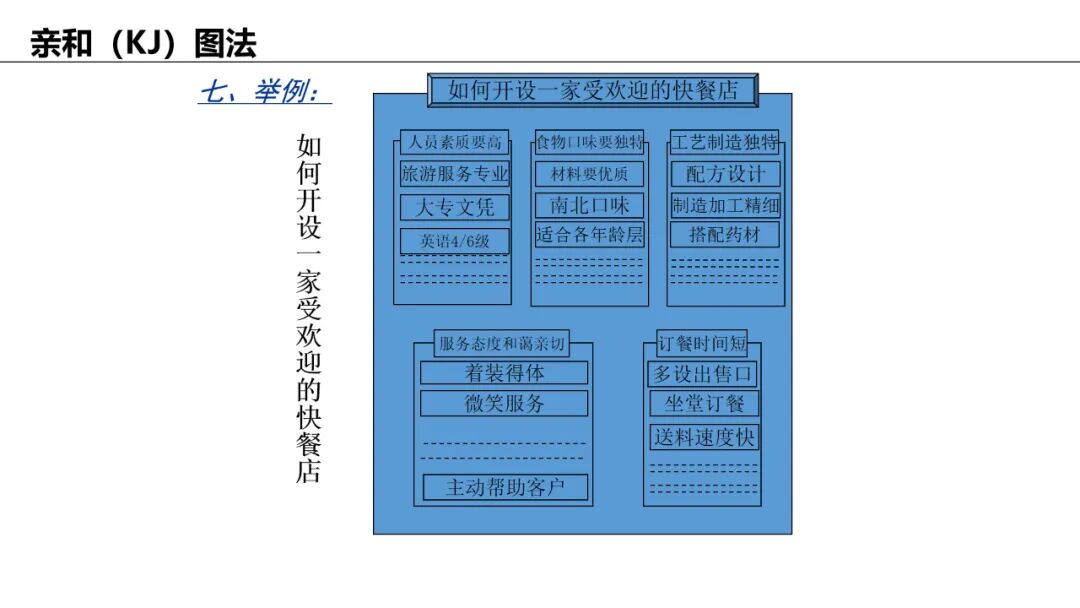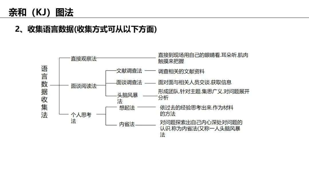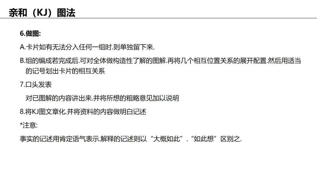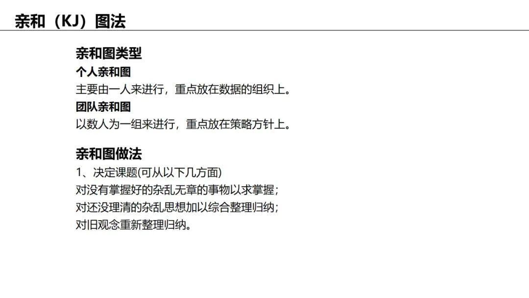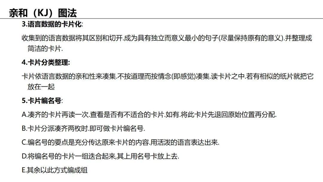 应用:归纳大量杂乱信息(如头脑风暴结果),自然分组并提炼主题。