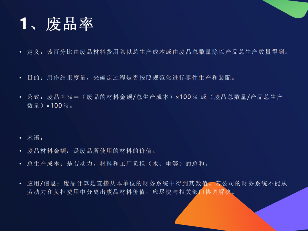 6. 废品率公式:(废品材料金额 ÷ 总生产成本)×100%或(废品数量 ÷ 总产量)×100%重点:直接反映资源浪费程度行动建议:高废品率应追溯至原材料、工艺参数、设备故障等