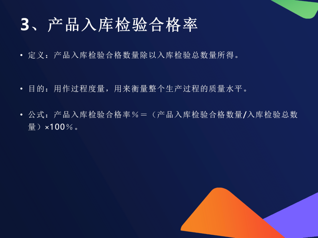 2. 进料检验合格率公式:(进料合格批次或数量 ÷ 总进料数量)×100%用途:监控供应商来料质量,推动源头治理目标值参考:≥98%为优秀,<95%需预警