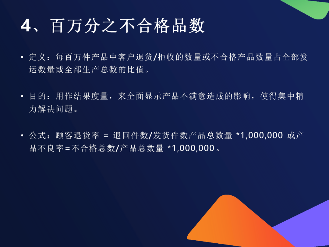 9. 百万分之不合格品数(PPM)公式:(退货数或不良数 ÷ 发货总数)×1,000,000行业标准参考:汽车行业:<100 PPM高端电子:<50 PPM优势:小概率事件也能被放大显示,利于持续改进