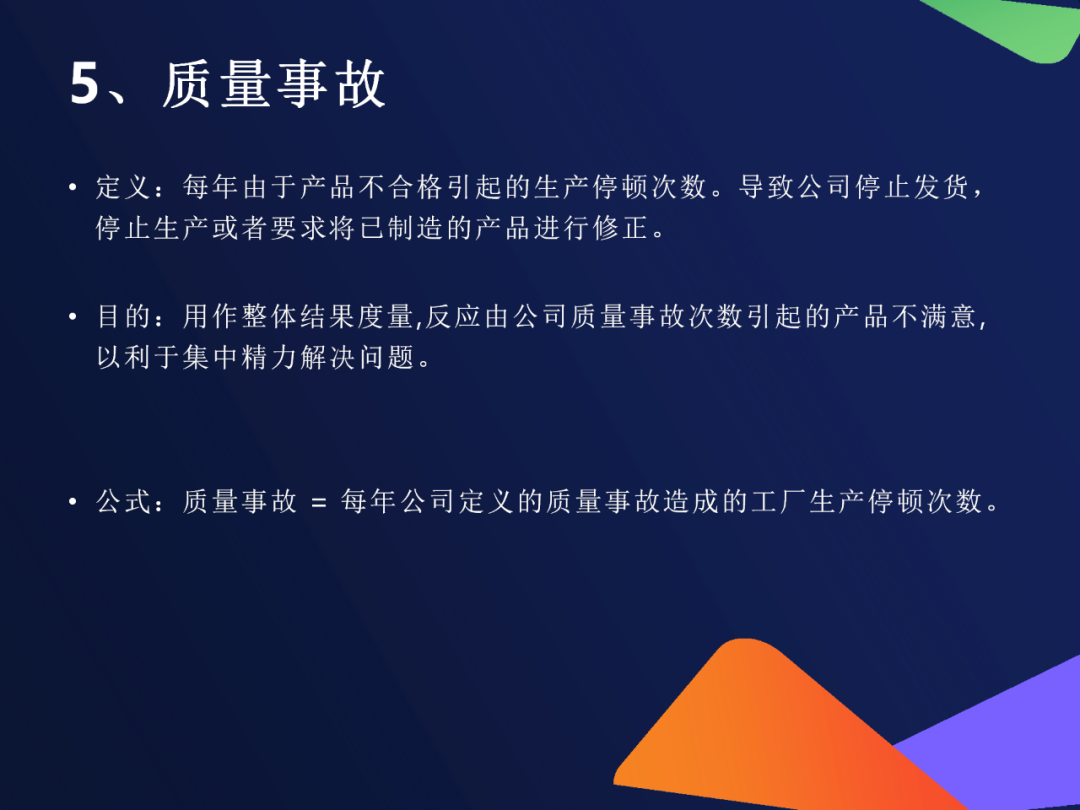 10. 质量事故次数定义:每年因质量问题导致停产、停发、召回的次数目的:作为重大风险事件统计,纳入管理层KPI考核示例:因标签错误暂停发货 → 记录为1次质量事故客户投诉引发全线返修 → 记录为1次