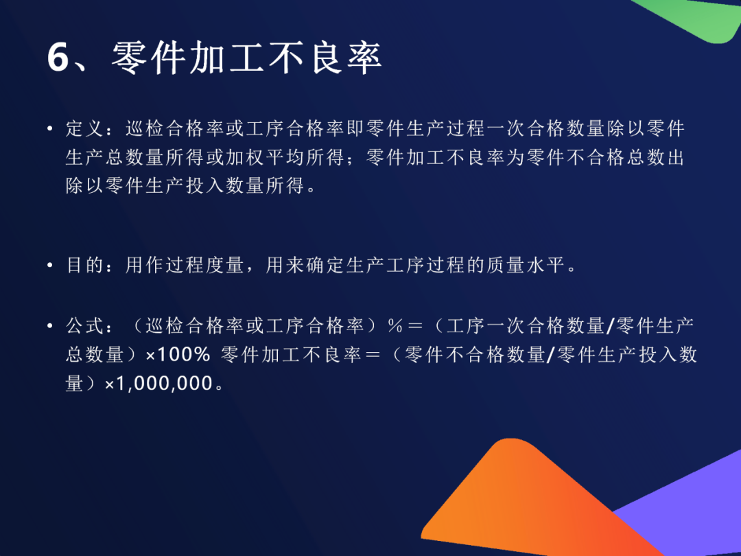 1. 零件加工不良率定义:零件不合格数 ÷ 投入生产总数 × 1,000,000用途:反映某道工序的稳定性和精度举例:若每百万件中有5000件不良 → 不良率为5000 PPM