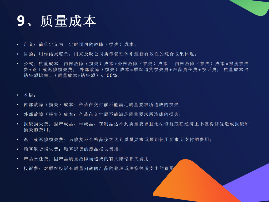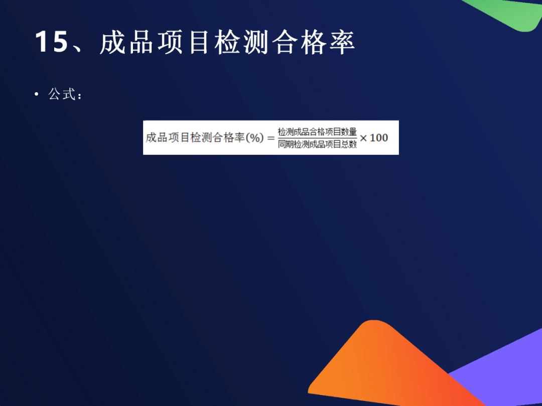 11. 成品项目检测合格率公式:(检测合格项目数 ÷ 总检测项目数)×100%适用场景:多项目综合检测(如安全、功能、外观等)价值:避免“单项短板拖累整体质量”✅ 第三类:质量成本与损失分析(算清“质量账”)