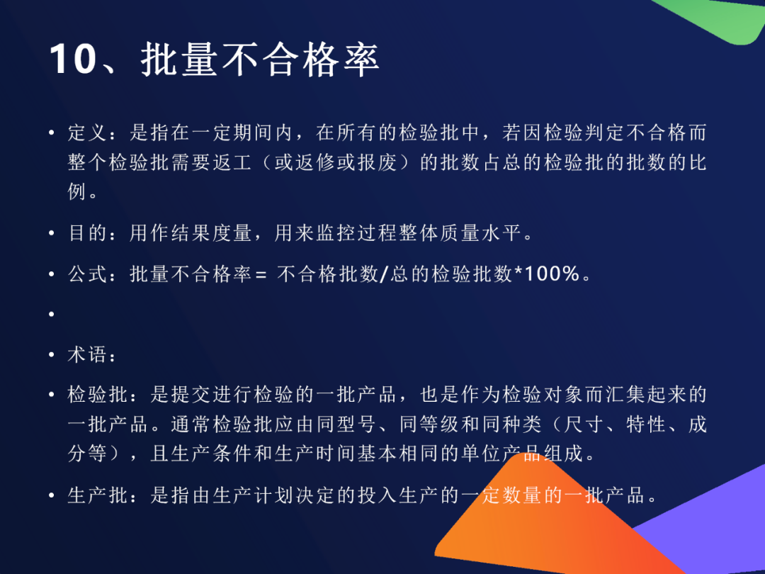 5. 批量不合格率公式:不合格批数 ÷ 总检验批数 ×100%说明:“整批返工/报废”的比例,反映系统性风险注意:一个批次中只要有一项不通过即算“不合格批”