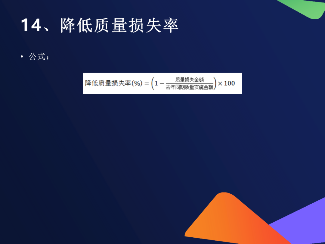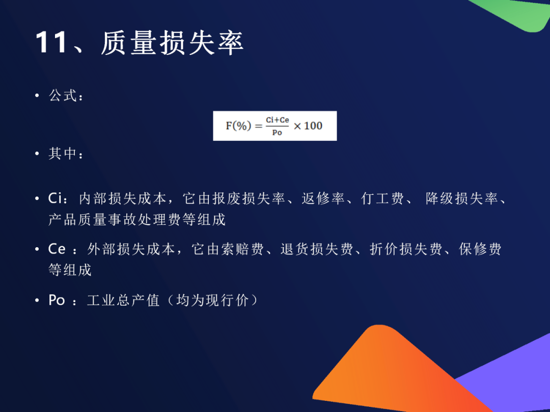 13. 质量损失率公式:质量损失率=内部损失成本 Ci+ 外部损失成本 Ce工业总产值 Po×100%质量损失率=工业总产值 Po内部损失成本 Ci+ 外部损失成本 Ce×100%组成Ci:报废、返修、停工、降级、事故处理费Ce:索赔、退货、折价、保修费用用途全面反映质量对企业经济效益的影响