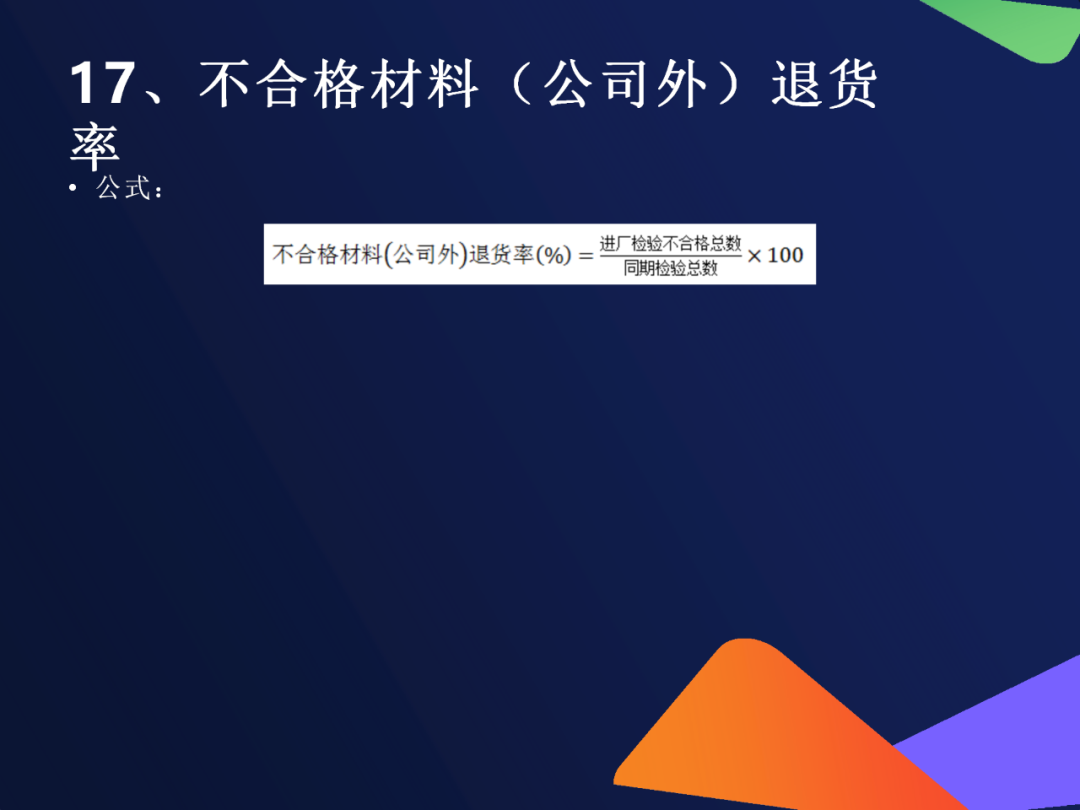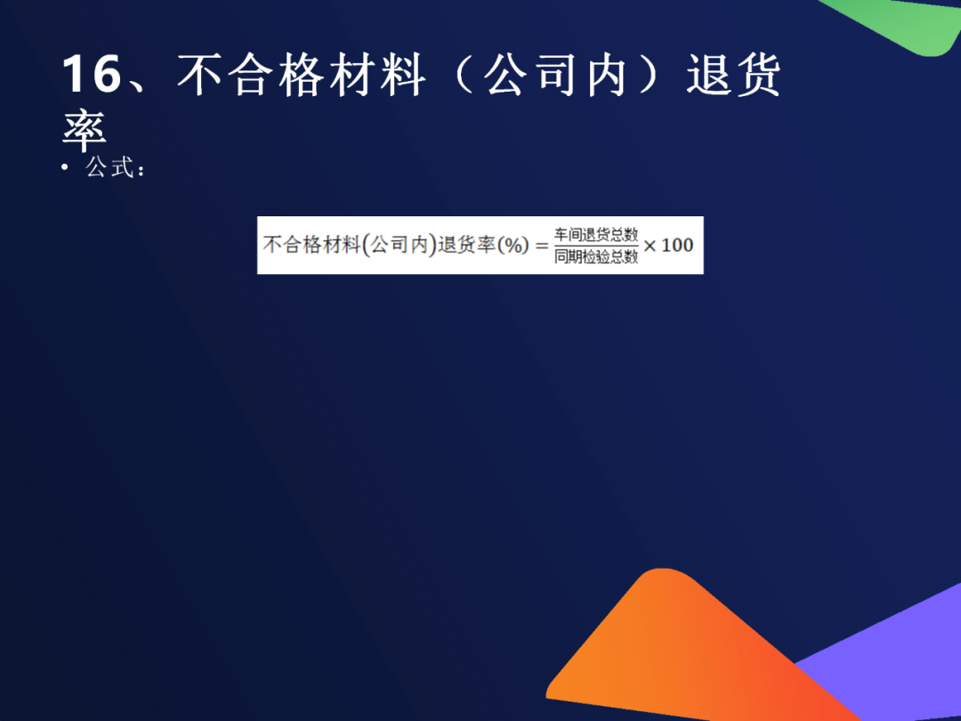 15. 不合格材料(公司内)退货率公式内部发现的不合格来料退货数 ÷ 总收料数 ×100%用途反映采购品控能力和供应商配合度