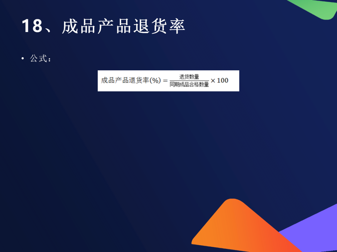 16. 不合格材料(公司外)退货率公式客户退回的我方供应材料数 ÷ 我方发货数 ×100%注意适用于做配套供货的企业(如零部件厂商)